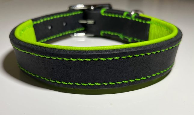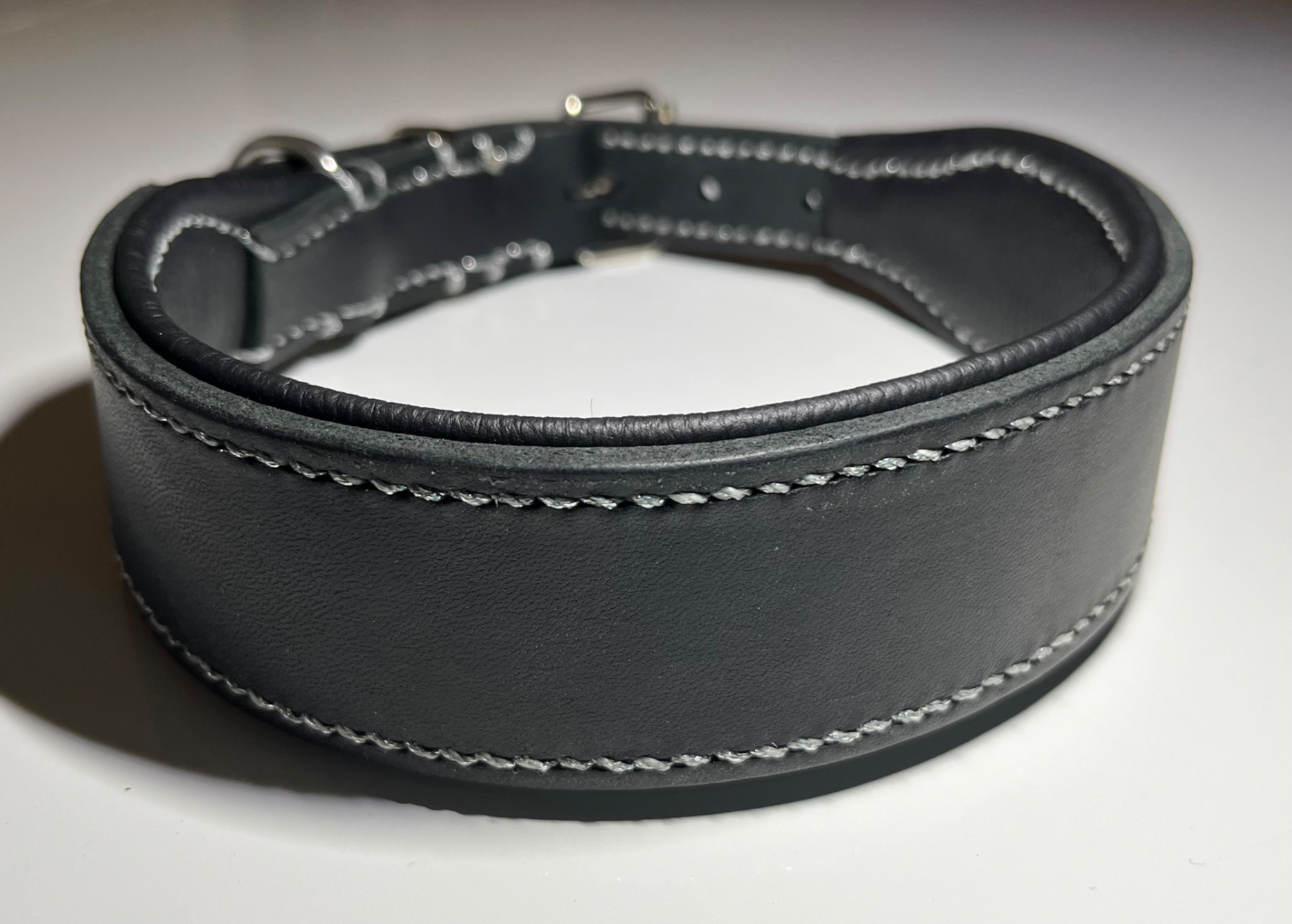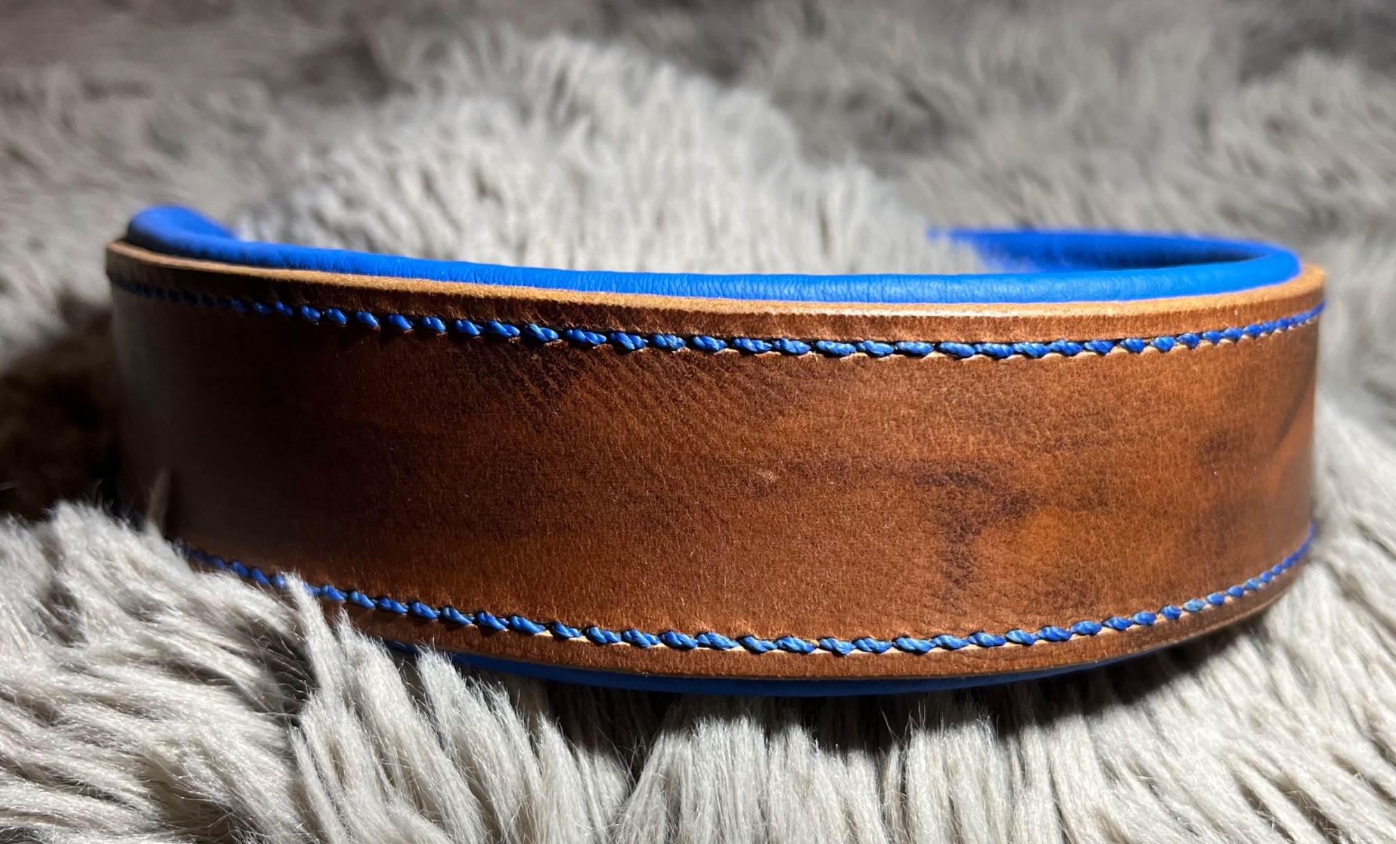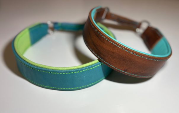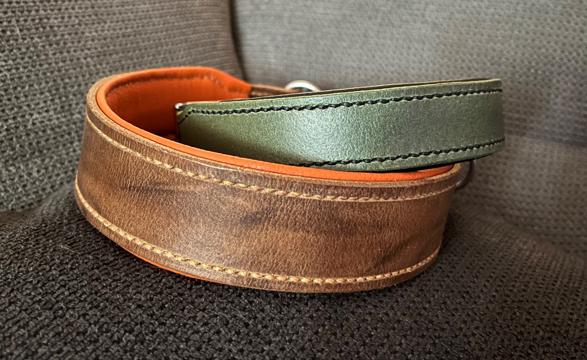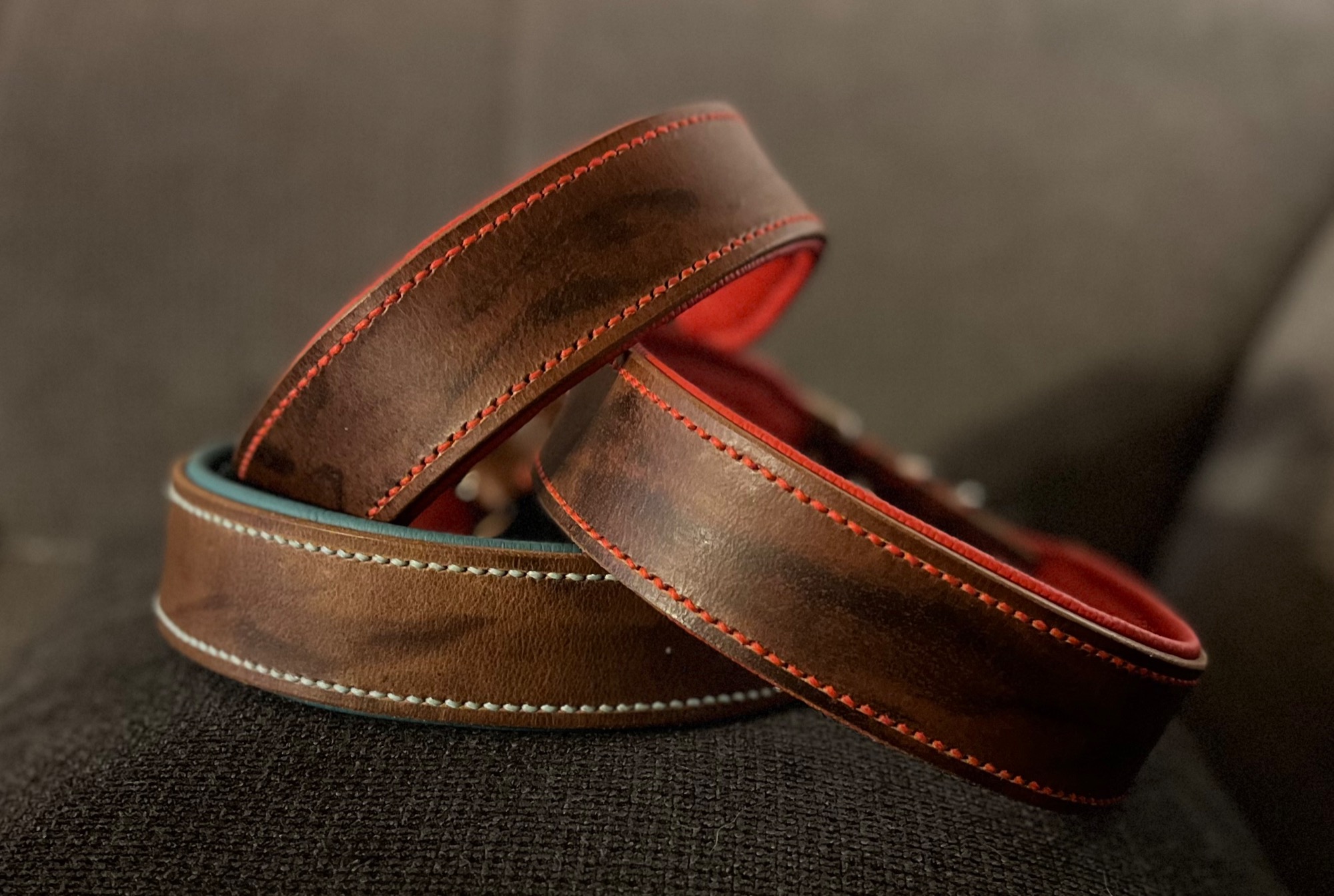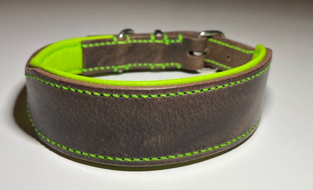 Ich fertige sowohl geflochtene Halsbänder aus Fettleder, als auch gepolsterte Lederhalsbänder an.