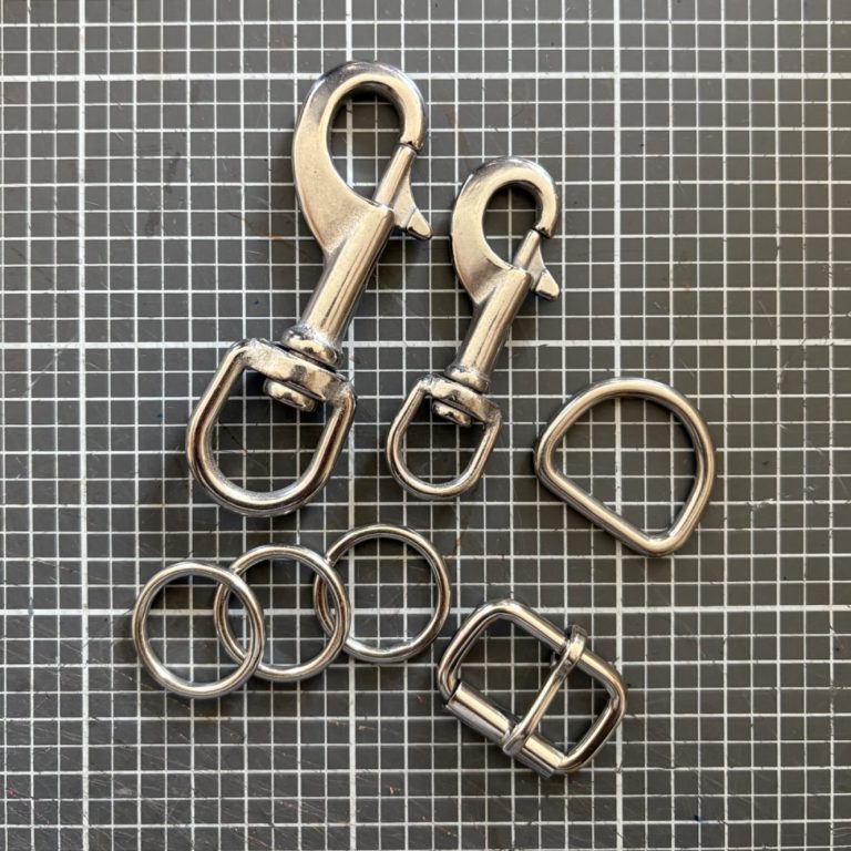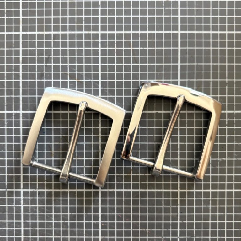 Die Gürtelschnallen, die ich standardmäßig verwende, sind aus Edelstahl, entweder poliert oder gebürstet. Es handelt sich um Vollmaterial, das bedeutet, dass sich nichts verfärben oder abplatzen kann.
